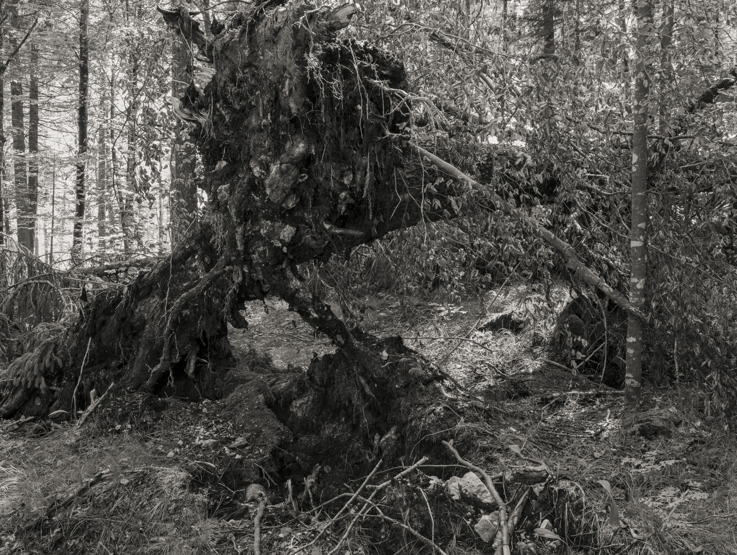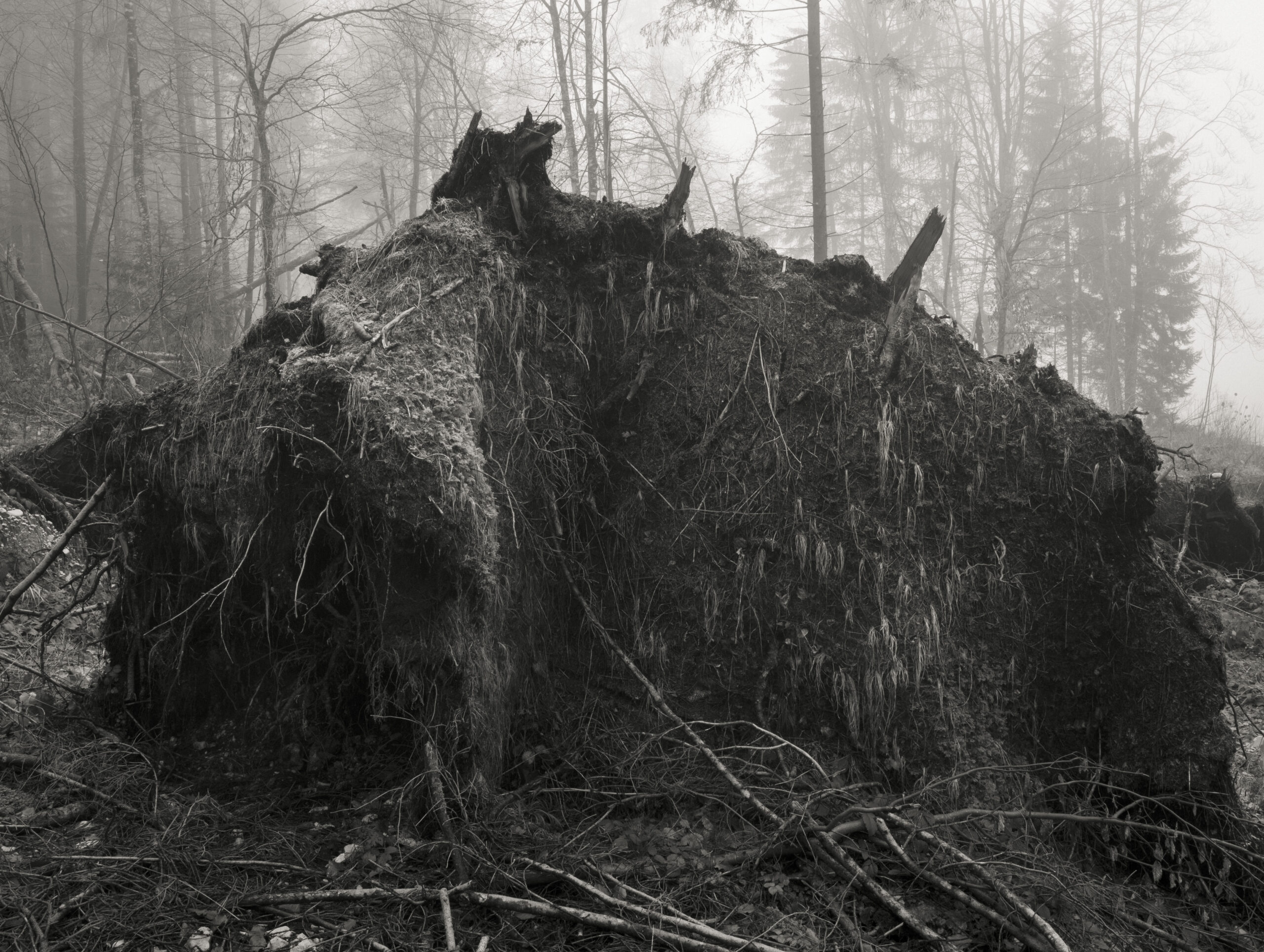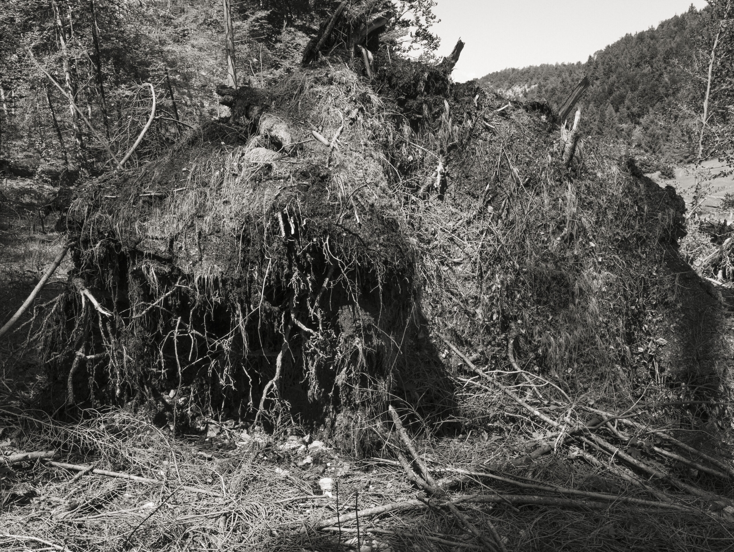 Martino Marangoni captures the aftermath of Storm Vaia that in 2018 caused immense damage to entire areas of the Mediterranean, including the Arte Sella international art space in Northern Italy. His lens focuses around the dramatic shapes of the tree roots exposed by the unyielding violence of the wind.