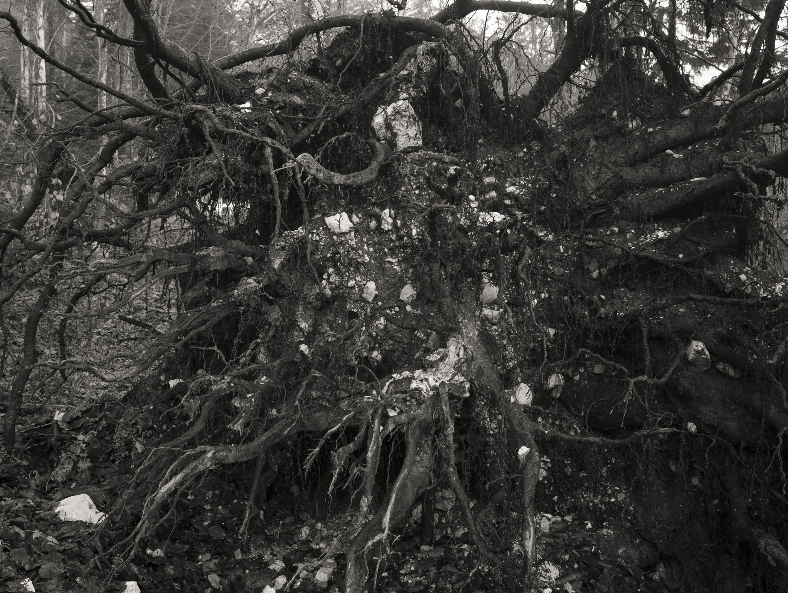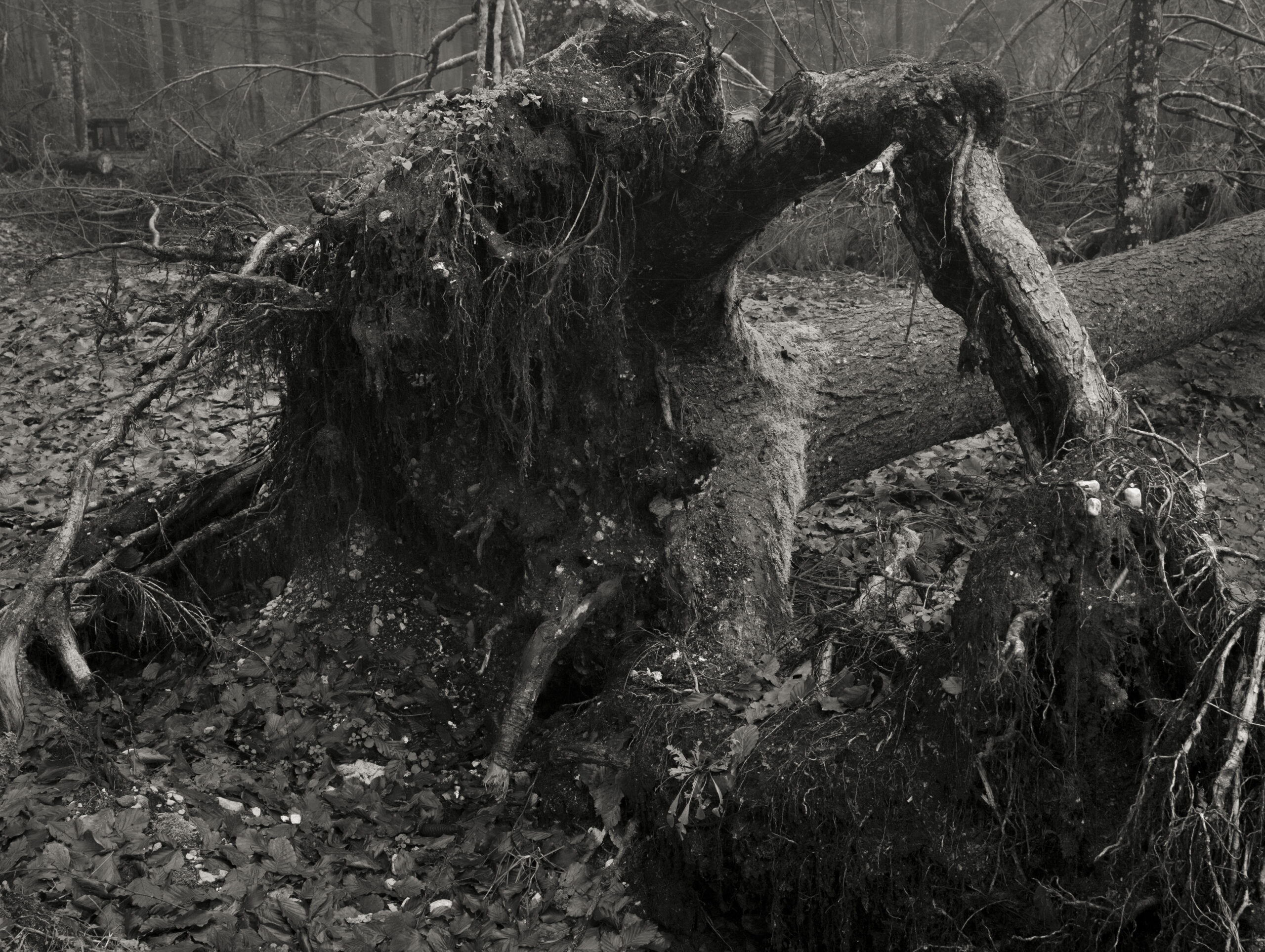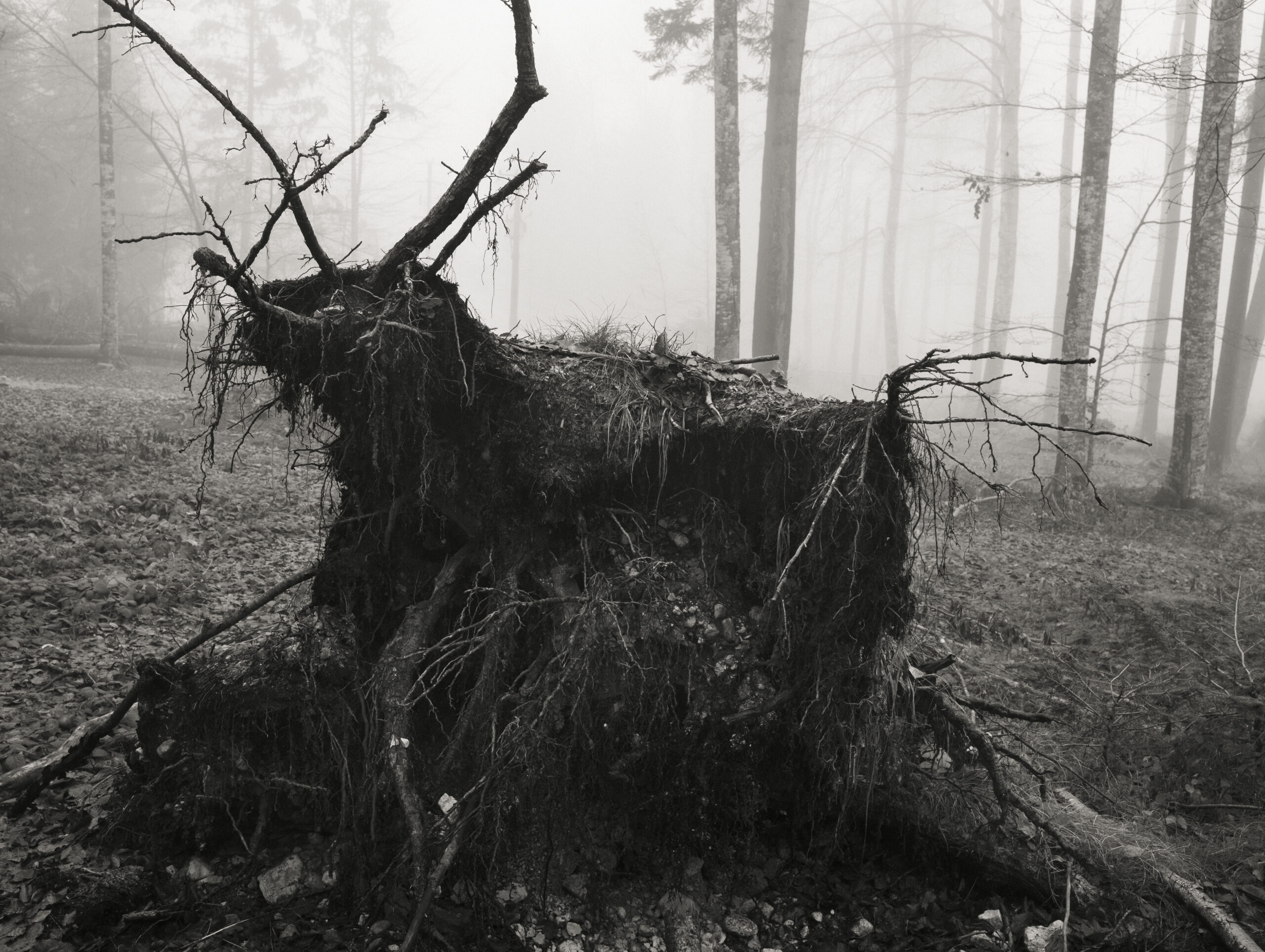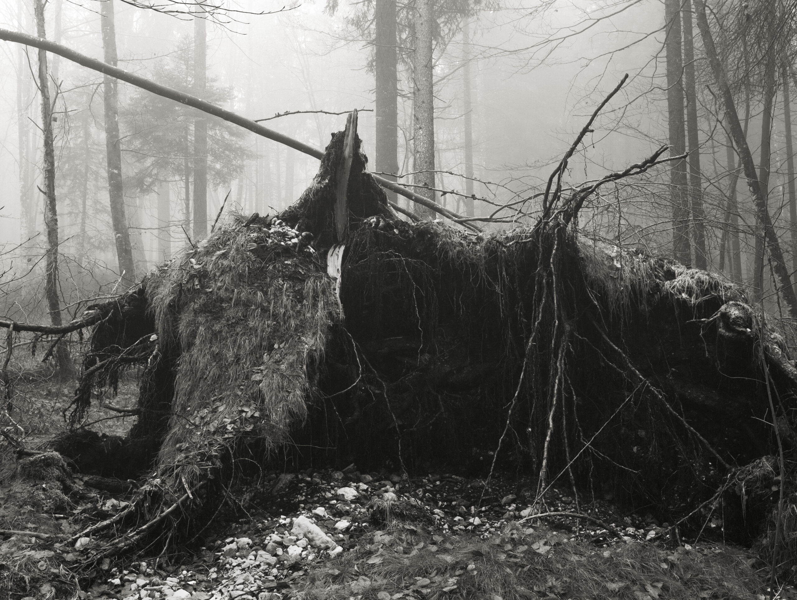 Martino Marangoni captures the aftermath of Storm Vaia that in 2018 caused immense damage to entire areas of the Mediterranean, including the Arte Sella international art space in Northern Italy. His lens focuses around the dramatic shapes of the tree roots exposed by the unyielding violence of the wind.